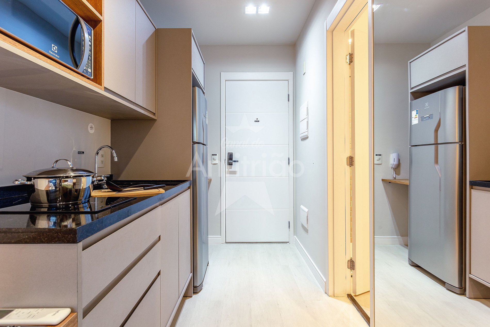 - Cozinha compacta com cooktop, microondas e geladeira