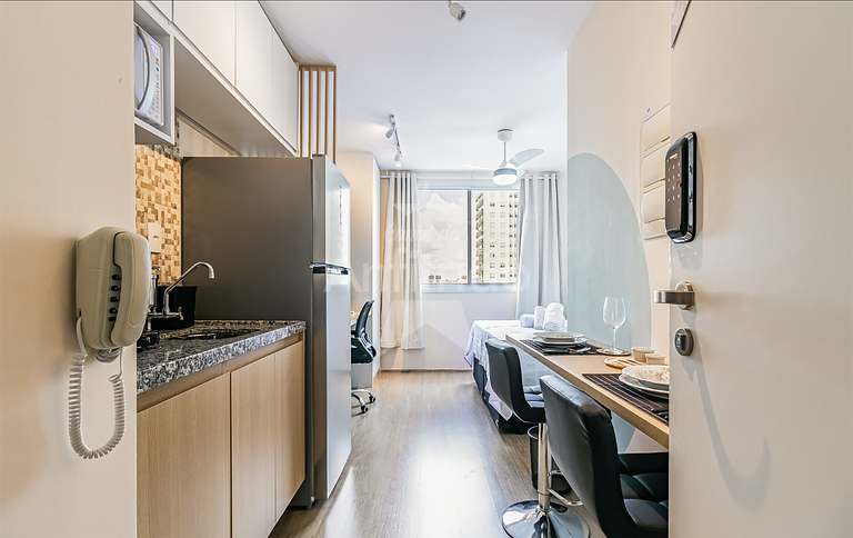 Studio com decoração de alto padrão pensado para curtas ou longas estadias. Perfeito para casais, pessoas viajando sozinhas a lazer/trabalho ou famílias com um filho. Estrutura para até 2 pessoas. Apê a 200 metros da estação do Brás em rua tranquila e silenciosa. Farmácia, padaria, mercados a um passo de distância, além de um parque bem arborizado a apenas uma quadra do studio.